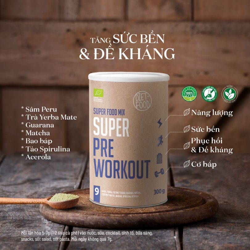 Bột hỗn hợp siêu thực phẩm Pre Workout Diet Food là một chế phẩm độc đáo chỉ gồm các thành phần Organic tự nhiên giúp thúc đẩy tăng trưởng năng lượng. Sản phẩm này có thể được sử dụng thành công để thay thế cho các bài tập trước khi tập luyện.